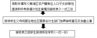 1.凡非南海户籍学生申请政策性借读都必须提供学生父母实际居住地村(居)委会计生部门证明,即《南海区非户籍常住人口子女政策性借读和中考申请计划生育情况审核表》(见附件1计生审核流程)。计生部门审核计生的办理时间为3月1日至4月27日。南海区户籍学生申请政策性借读的无需办理计生审核。
