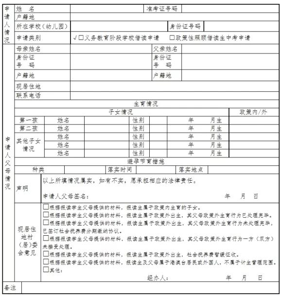 (5)《南海区非户籍常住人口子女政策性借读和中考申请计划生育情况审核表》。报读学生属南海区内户籍且在南海区内报读的,免予办理计生审核。政策性借读生计生审核办理截止到4月27日。