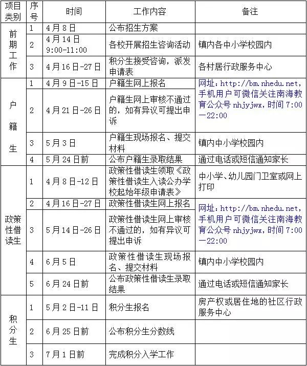 (一)户籍生:拥有本镇户籍达到“人户一致”条件的小学一年级新生(适龄儿童)以及报读初中一年级的应届小学毕业生,按报名时间登陆报名系统http://bm.nhedu.net(电脑版)、手机微信关注微信公众号“南海教育”提交报名信息和证明材料。完成网上报名后,同时对照申请类别带齐所需材料到学区划分所在的学校确认报名。