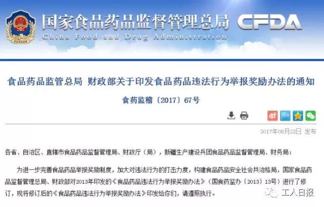 为进一步完善食品药品举报奖励制度,加大对违法行为的打击力度,构建食品药品安全社会共治格局,2017年,国家食品药品监督管理总局、财政部对2013年印发的《食品药品违法行为举报奖励办法》(以下简称《办法》)进行了修订。