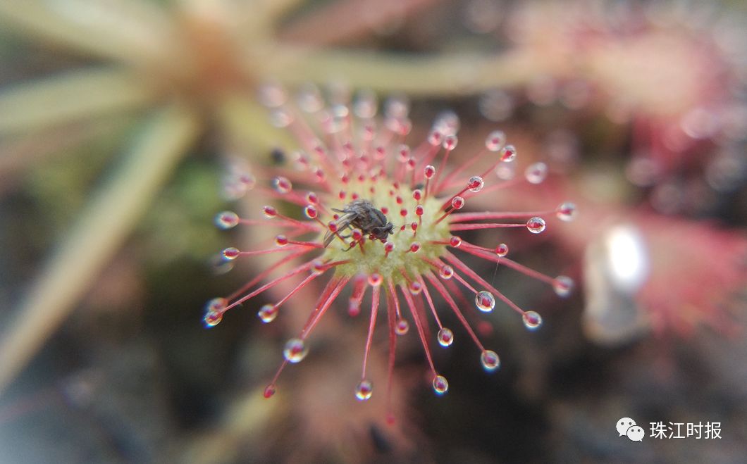 茅膏菜叶面腺毛上的“露珠”,其实是黏液,只要黏住昆虫后叶子就会卷缩,将猎物紧紧裹卷,让其无法逃脱。小虫越挣扎,触碰面积越大,茅膏菜就会黏得越紧。最后经过消化液的作用,小虫就这样成了茅膏菜的“美餐”。
