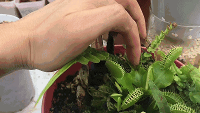 拿一段棍子试探下,捕蝇草原本张开的大口一言不合便关上大门,行动迅速!两边叶子形成了一个“蚌”壳状,紧紧地夹住不放。如果挣扎得越厉害,捕蝇草将夹得越紧。