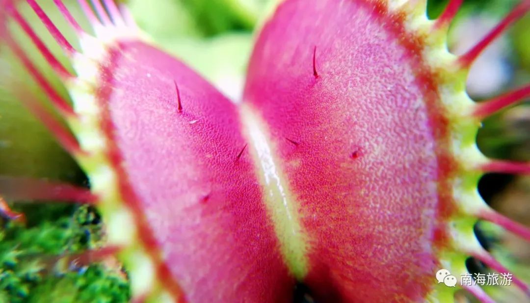 捕蝇草外表有点高冷,酷酷的,叶片边缘会有规则状的刺毛,据说像维纳斯的睫毛一般,被称为“维纳斯的捕蝇陷阱”。这些刺毛会分泌出粘液,使得叶瓣粘合,防止昆虫逃走。