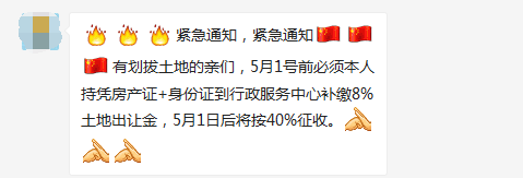 “5月1日前必须本人持凭房产证+身份证,到行政服务中心补缴8%土地出让金,5月1日后将按40%征收……”