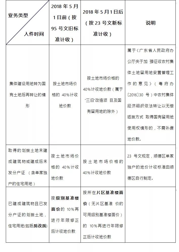 2018年3月31日 ,佛山市人民政府印发了《佛山市国有建设用地使用权价格及租金计收标准的通知》(佛府〔2018〕23号,以下简称23号文),该标准自印发之日起在佛山市范围内施行,有效期为5年。此前执行的2010年印发的《佛山市国有建设用地土地出让金及租金计收标准的通知》(佛 府〔2010〕95 号,以下简称95号文)同时废止。各区施行的地价款和租金标准不得低于该23号文的规定。 23号文施行前已向国土资源管理部门递交土地变更登记申请或出让申请的,须在规定3个月内签订土地出让合同并补交地价款,仍按原施行标准执行,否则按新标准执行。本标准施行后的1个月内向国土资源管理部门递交土地变更登记申请或出让申请的,可按原施行标准执行。23号文施行前已签订的租赁合同,按合同约定标准缴交租金,合同到期后按23号文规定的标准施行。