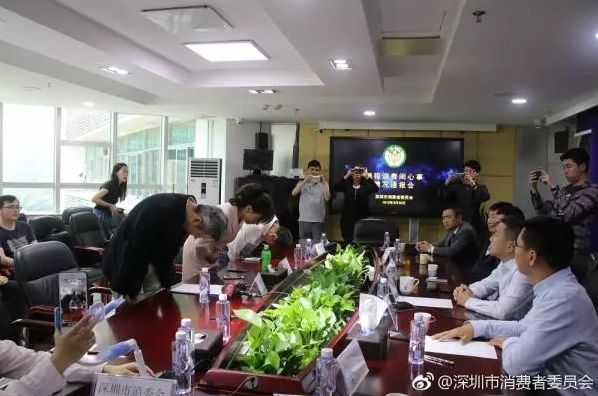 图为携程CEO及华南区总经理、深圳总经理一行三人鞠躬道歉。