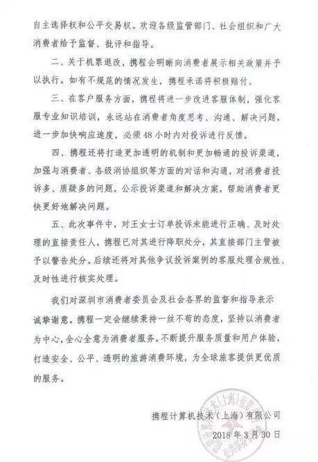 王女士将问题投诉至深圳市消委会。3月8日,深圳市消委会联合福田区消委会依据《消费者权益保护法》赋予的社会监督职责,向携程深圳公司发出监督函并进行了约谈。