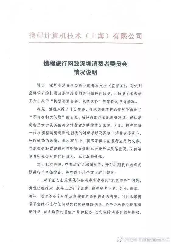 深圳消委会今日(30日)表示,携程承诺对于机票差价问题在技术、服务上进行改进。