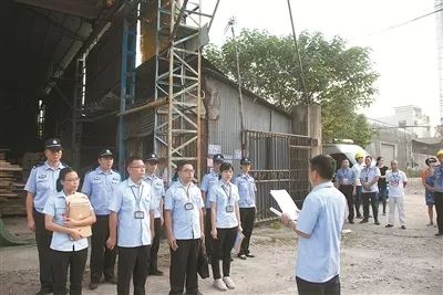 (陈村镇合成工业区拒不履行土地清空和交还义务,顺德法院的执行人员现场强制清空土地。图为执行人员集结准备行动。)