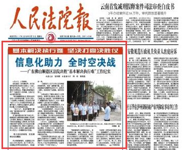 自今年5月4日《人民法院报》第4版“综合新闻”以《“执行110”,24小时值守》为题,报道我院“执行110”工作经验和成效后, 5月13日,《人民法院报》头版头条又以《信息化助力,全时空决战—广东佛山顺德区法院决胜 “基本解决执行难”》为题,全方位深度报道了顺德法院全面决胜执行难,创新执行工作机制纪实。