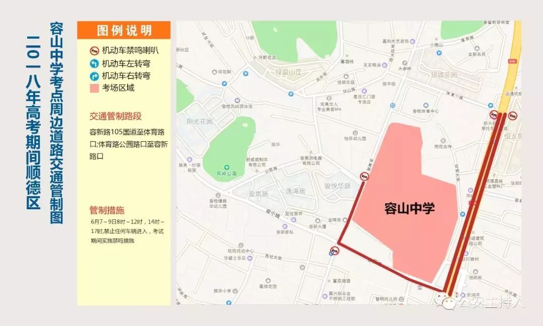 6月7~9日8时~12时,14时~17时实施交通管制,容新路105国道至体育路口、体育路公园路口至容新路口,禁止任何车辆进入,考试期间实施禁鸣措施。