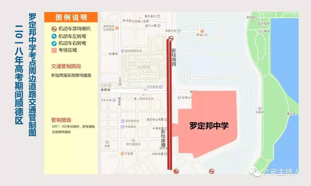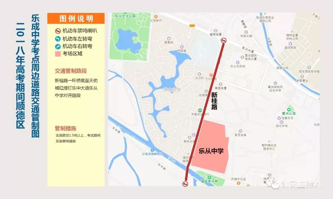 新桂路一环桥底至天佑城红绿灯乐中大道乐从中学对开路段实施限货1.5吨以上,考试期间实施禁鸣措施。