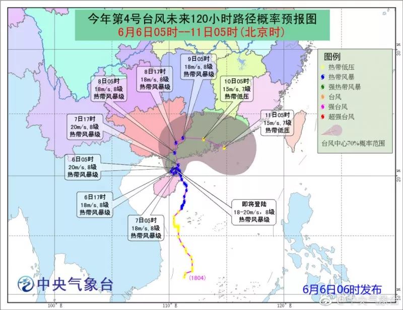 据广东省气象服务中心,今年第4号台风“艾云尼”(热带风暴级)已于6月6日6时25分在湛江徐闻新寮镇沿海地区登陆,登陆时中心附近最大风力8级(20米/秒)。