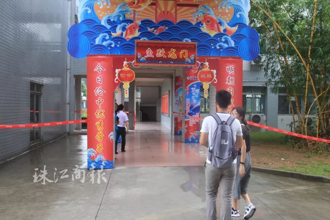 ▲在伦教中学考点,记者见到校方布置了“鱼跃龙门”牌坊,为考生加油打气。/珠江商报记者朱德文摄