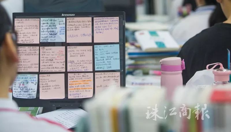 ▲由于课室成为考场,顺德一中的高三学生在实验室进行考前复习,一位同学的复习要点贴满了实验室的显示器。/珠江商报记者周焯杰摄
