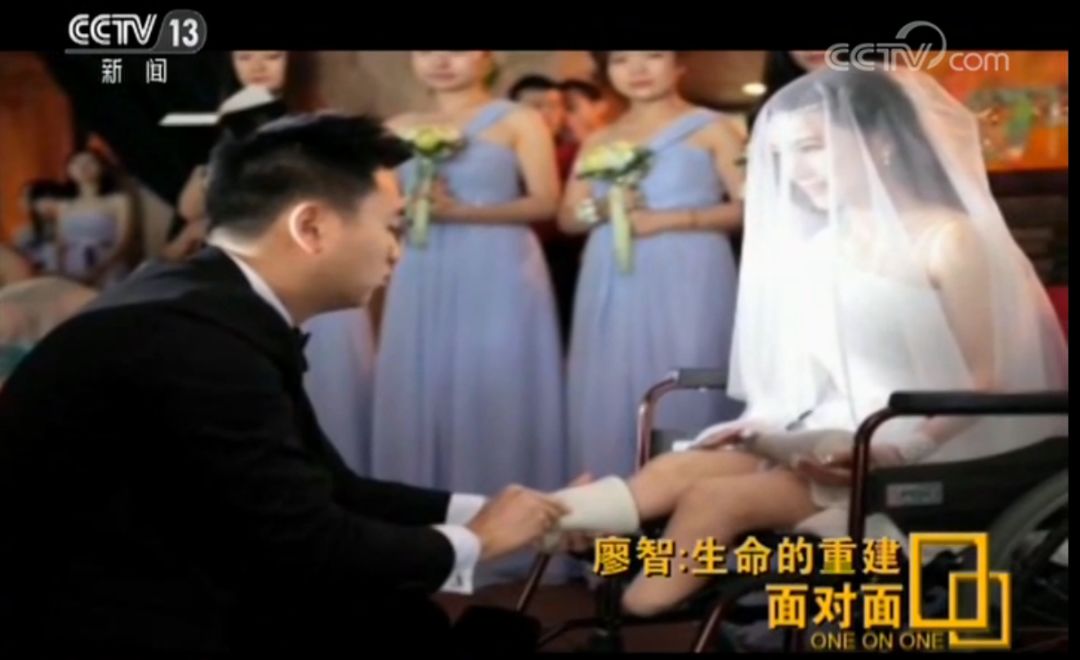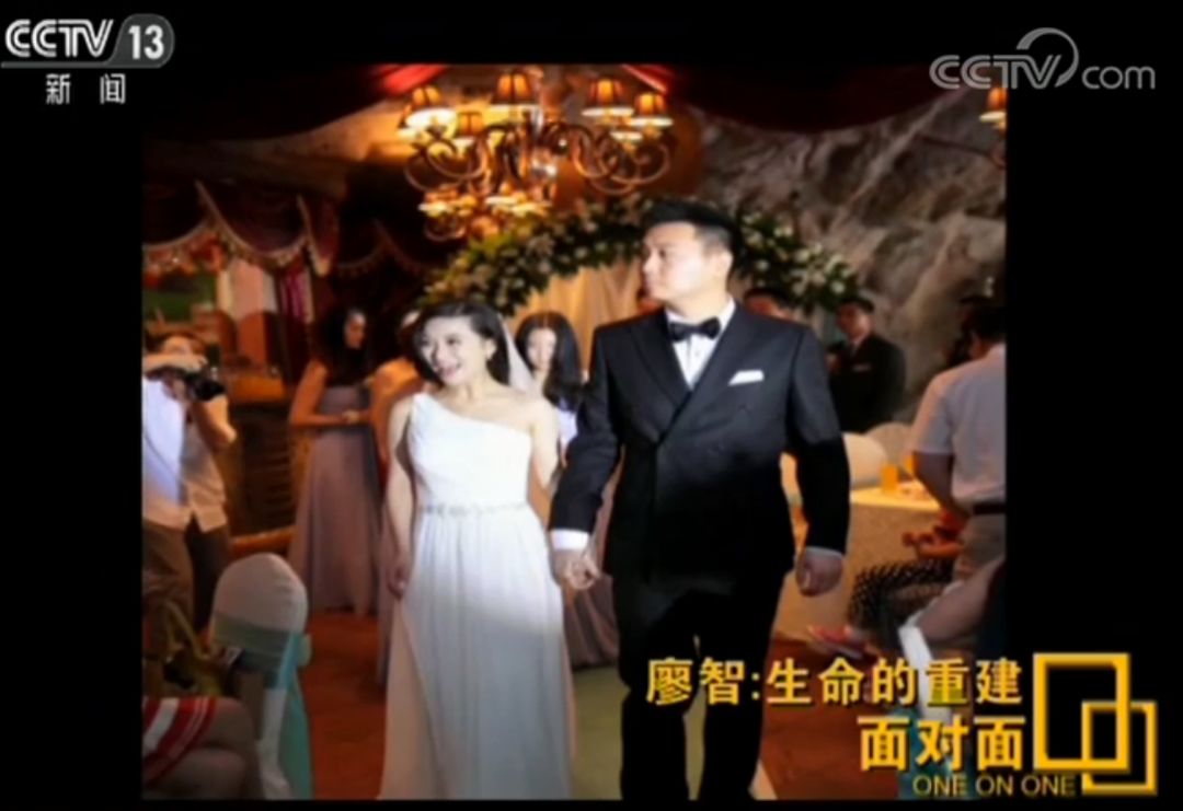 2014年,廖智与这位假肢技师结婚。婚礼上有一个特别的环节,廖智坐着轮椅出场,丈夫亲手为她穿上义肢,然后再一起走过红毯。这是廖智的丈夫特别要求的,他说,我希望人们知道我娶的是怎么样的一个女人。我爱她没有腿的样子,也爱她站在高跟鞋上、站在美丽的假肢上的样子。