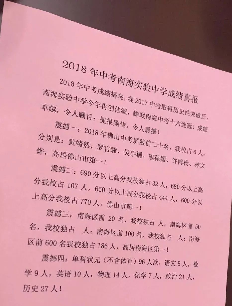 ● 南海外国语学校 王钰瑶、李宇诗、李睿3位同学成为2018年佛山中考高分屏蔽考生!单科最高分合计46人:语文单科最高分4人,数学单科最高分3人,英语单科最高分4人,化学单科最高分3人,物理单科最高分5人,政治单科最高分14人,历史单科最高分13人, 680高分人数达45人,690高分人数达13人。(文/佛山日报记者吴培)