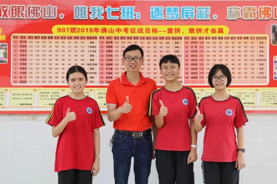 ▲南海外国语学校高分考生王钰瑶(左一)、李宇诗(左三)、李睿(左四)与班主任合影。三位同学均出自该校907班。(图/佛山日报记者王澍)