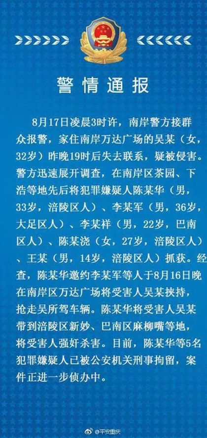 2、女子被抢车挟持奸杀案5名嫌犯被批捕 其中最小嫌犯14岁 18日,重庆南岸区人民检察院以涉嫌抢劫罪、强奸罪、故意杀人罪对犯罪嫌疑人陈某华等5人批准逮捕,其中嫌疑人王某仅14岁。今年8月陈某华等人驾车挟持一名女子,将其带至涪陵区新妙镇强奸,并将其带至巴南区麻柳嘴镇杀害。(正义网)