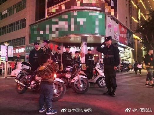 1、小男孩用一个敬礼 温暖了夜巡民警的心 近日,为保障宁夏回族自治区成立60周年大庆顺利进行,民警每晚开展夜间巡逻。16日晚,银川新华街步行街口,一名四五岁的小男孩跑到巡逻队伍前,向中队长周楠敬了一个礼,周楠立即回礼。这一幕被巡防队员记录了下来。 (@平安宁夏)