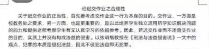 关于迟交作业的正当性,首先要考虑交作业这一行为本身的目的。交作业,一方面是校教务处之要求,另一方面,也是更重要的,是以此培养学生独立运用所学知识解决问题的能力和提供老师考察学生有无认真学习的依据参考。因此,若迟交作业而不违背交作业的目的,实质上并没有构成法益的侵害。以张明楷教授在《刑法与法益侵害说》一文中的观点,犯罪的本质是侵犯法益,因此不侵犯法益即无犯罪。