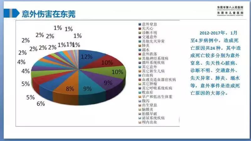 而该院统计的2012~2017年收治的1~4岁病例中造成死亡的原因共24种,意外窒息占12%排在首位,交通意外9%,溺水6%,意外跌落5%,其他意外2%,意外伤害总共占了34%。