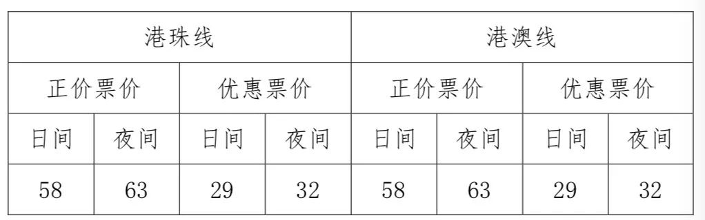优惠票日间为33港币/澳门币,夜间为35港币/澳门币