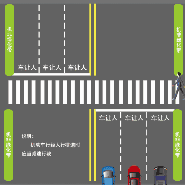 也就是说:不论行人行走的方向,不管行人在第几个车道,不论行车道是双向四车道或双向六车道,只要是行人行走方向前方相邻的两个车道,机动车就必须停车让行。图中①、②车道上的机动车应当停车让行。