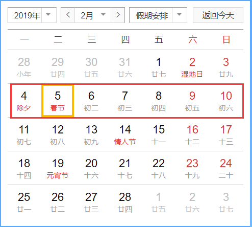 2019年春节是2月5日(星期二),根据规定春节法定放假时间是除夕到初六,放假时间为2019年2月4日至2月10日,放假7天。