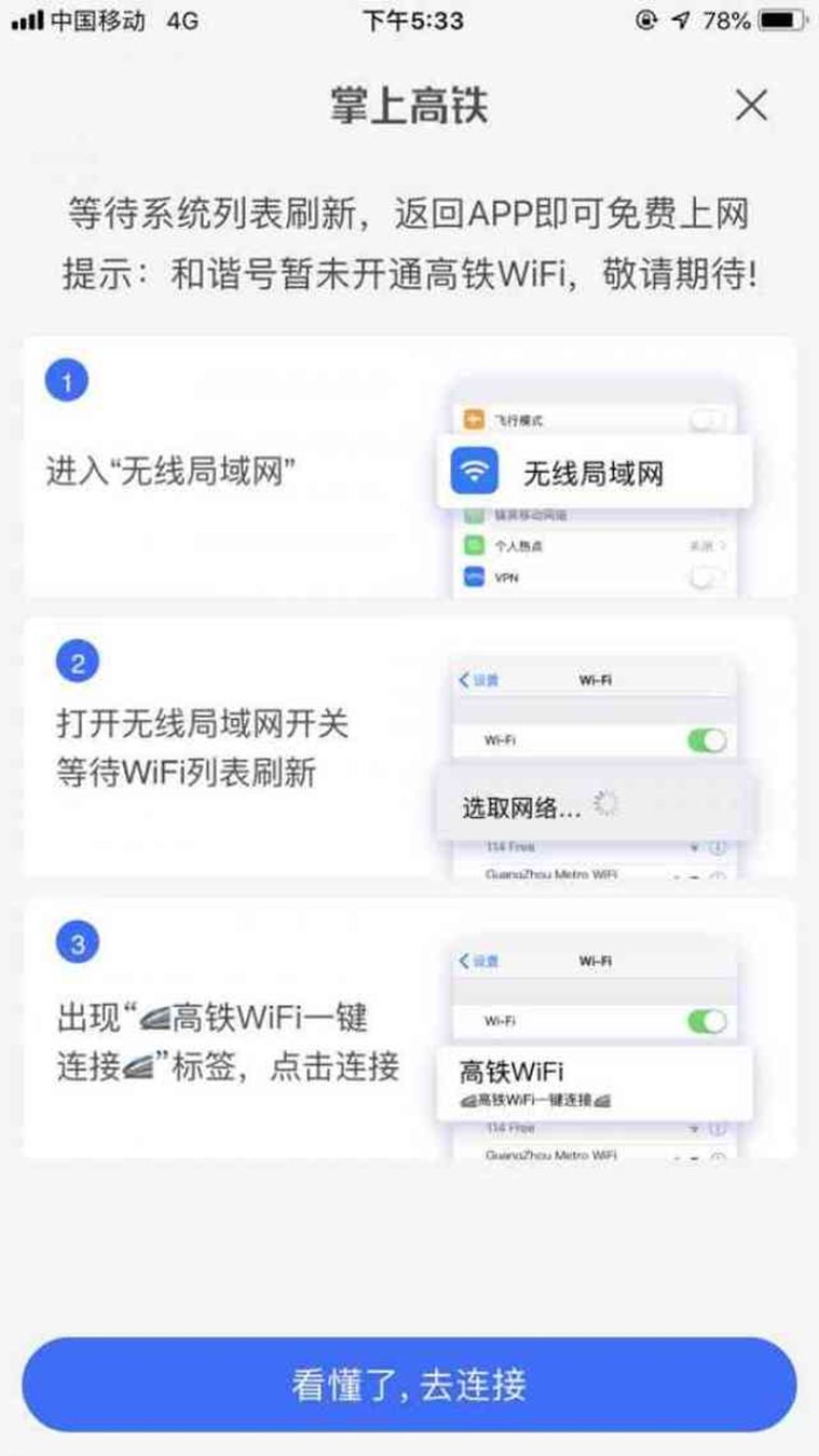 5、高铁可以连WiFi了,还是免费的! 春运好消息!继京沪高铁“复兴号”实现WiFi信号全覆盖后,其他高铁上也有WiFi了。中国铁路官方WiFi入口“掌上高铁APP”已经可以下载使用,能够在保障用户信息安全基础上,为广大旅客提供流畅、免费的高铁WiFi服务。(@北京日报)