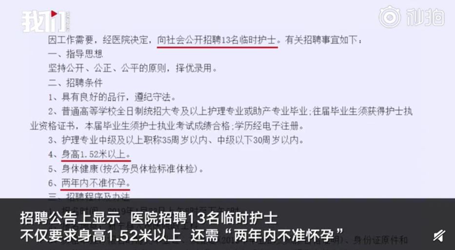4、医院回应护士两年内不准怀孕 日前,湖南新宁县人民医院一则招聘启事引争议。该院公开招聘13名临时护士,要求“两年内不准怀孕”。对此院长徐玉光称“有难处”。他说,如果刚招进来的护士又要休产假,医院工作根本无法搞,还不如不招。(@新京报我们视频)