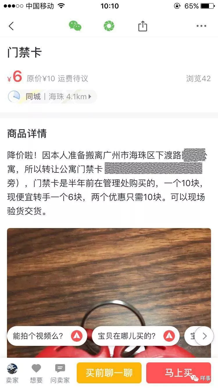 在闲鱼上,有人转手花都花东镇某小区东区某栋的门禁卡。帖子底下,有人在评论提出质疑“这个也可以卖?不同楼栋也用不了”,有人则“建议楼主卖的时候让买家提供业主证会好些”。