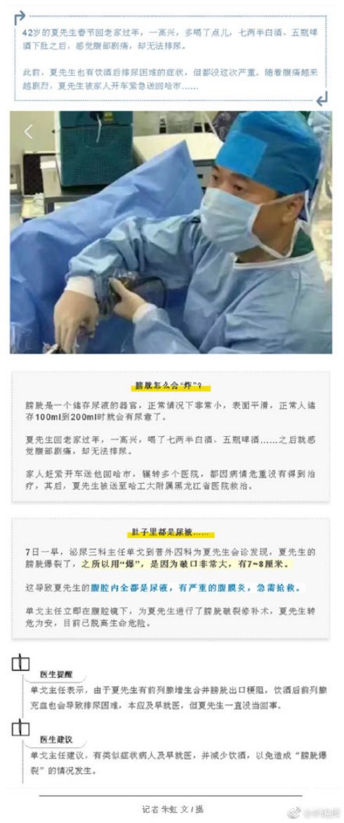 5、42岁男子喝7两白酒+5瓶啤酒 膀胱炸了! 哈尔滨的夏先生大量饮酒后被诊断为膀胱爆裂。医生建议,有前列腺增生症状病人应及早就医,并减少饮酒,以免造成“膀胱爆裂”的情况发生。(@燕赵都市报)