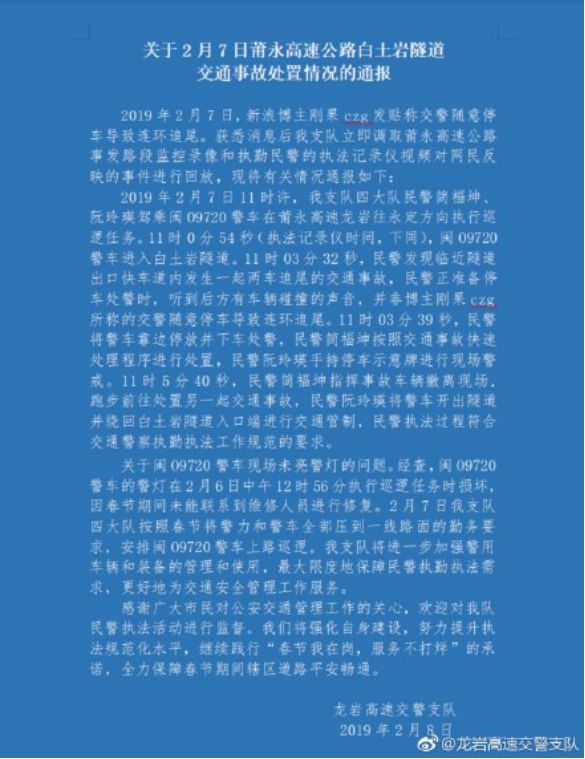 3、交警随意停车致连环追尾?福建龙岩警方回应 7日,有网友发帖称,交警随意停车导致连环追尾。8日,龙岩高速公路支队表示,民警执法过程符合交通警察执勤执法工作规范的要求。警车现场未亮警灯,系执行巡逻任务时损坏,春节期间未能联系到维修人员进行修复。(@中国新闻网)
