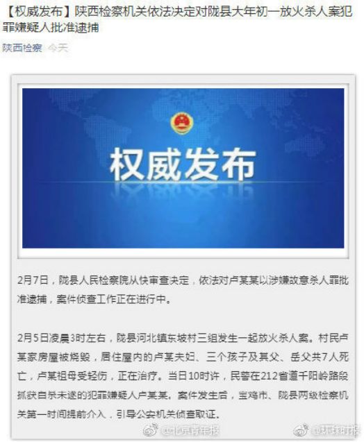2、陕西宝鸡恶性伤人事件致7死1伤 嫌犯被批捕 7日,陇县人民检察院从快审查决定,依法对卢某某以涉嫌故意杀人罪批准逮捕,案件侦查工作正在进行中。5日,当地东坡村发生一起放火杀人案,一家七口遇害,其中包括三名儿童。(@陕西检察)