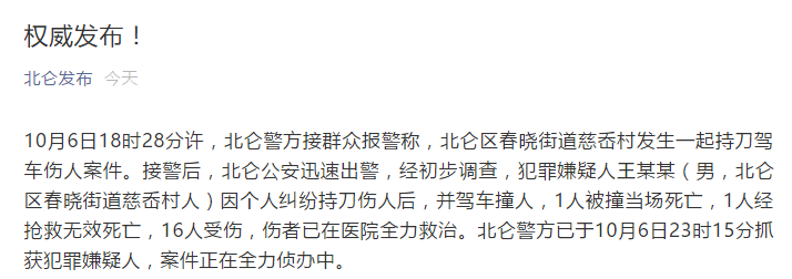 接警后,北仑公安迅速出警,经初步调查,犯罪嫌疑人王某某(男,北仑区春晓街道慈岙村人)因个人纠纷持刀伤人后,并驾车撞人,1人被撞当场死亡,1人经抢救无效死亡,16人受伤,伤者已在医院全力救治。北仑警方已于10月6日23时15分抓获犯罪嫌疑人,案件正在全力侦办中。