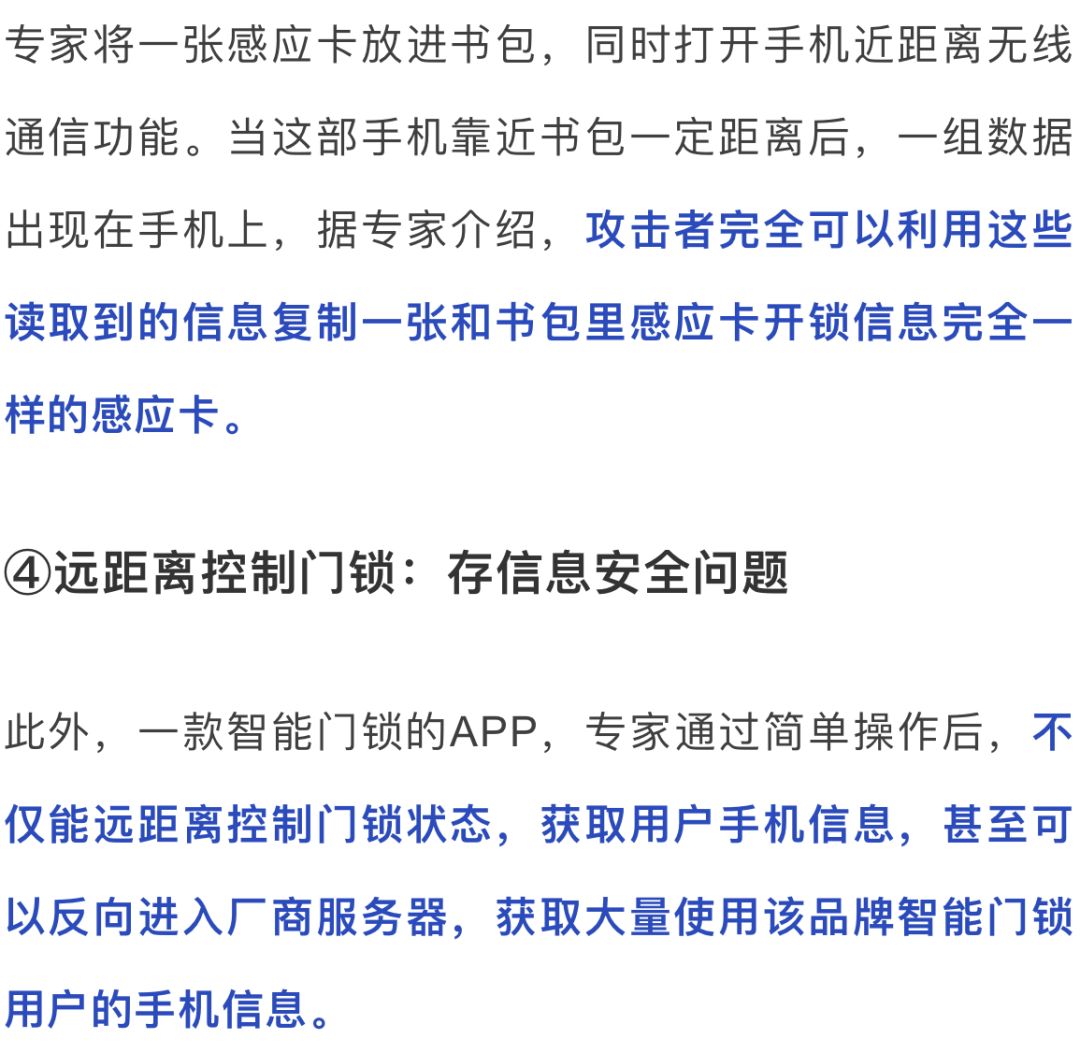 建议消费者尽量不使用或关闭人脸识别功能和远程开锁功能,在日常使用中妥善保管好信息识别卡,防止被非法读取和复制。