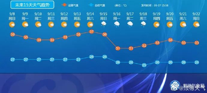 9月15日:多云间阴天,有雷阵雨,局部大雨,气温28~36℃;