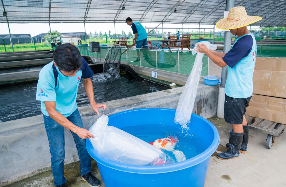 作为一种高档观赏鱼,佛山的观赏鱼养殖产业起步早,擅深耕,很早就成为全国最大的锦鲤养殖集散地之一。不少锦鲤场星罗棋布分布在万顷园艺世界园区里。万顷园艺世界位于佛山4个省级现代农业产业园之一的南海花卉园艺产业园内。而海港锦鲤是该园区内最大的锦鲤养殖场。