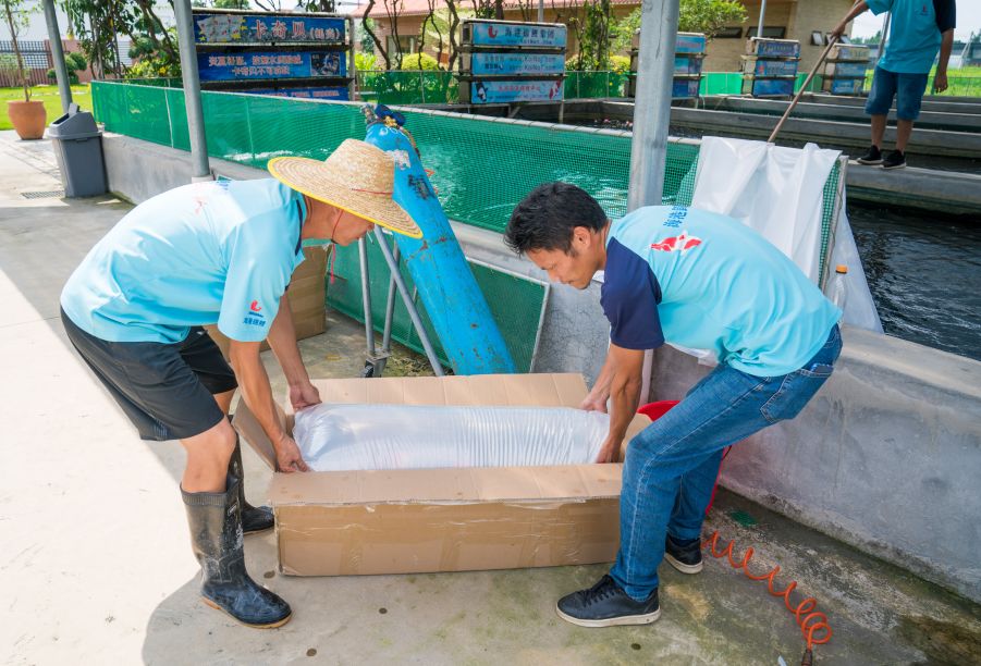 工作人员正熟练地把几条红白锦鲤打包、入袋、装车,准备给客人送货。