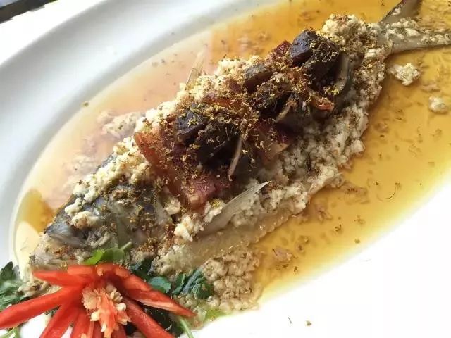 桂花酒糟蒸鲥鱼选用稀有的长江鲥鱼,在原苏菜系做法的基础上根据顺德人的口味而改良,以干桂花与自制酒糟来蒸,上面放入金华火腿加花菇添香。这道菜将鱼的清甜、桂花的甘香和酒糟独有的香味融为一体,鲥鱼酒香四溢,鲜嫩味美,齿颊留香。