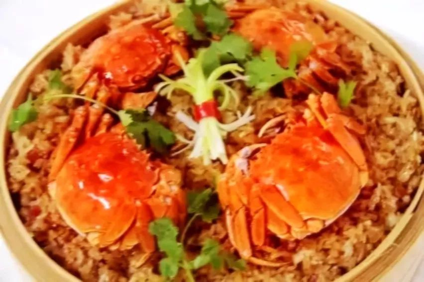 大闸蟹蒸糯米饭用糯米与螃蟹来相搭配,让糯米的温补减弱螃蟹的寒凉,起到中和的作用。米饭甘香油润,与蟹肉拌食,令人回味无穷。