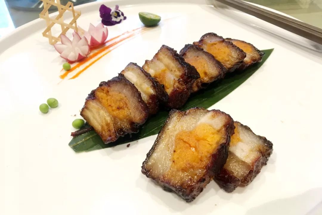 这里的咸蛋黄叉烧是香港美食家蔡澜3次来顺德都必点的菜肴。叉烧选用200斤以上的黑毛猪的最好部位的肉腩,咸蛋黄则选取红油起沙的咸蛋黄,腌制2个小时,再需专人烤制2个小时,直到叉烧外焦里嫩。