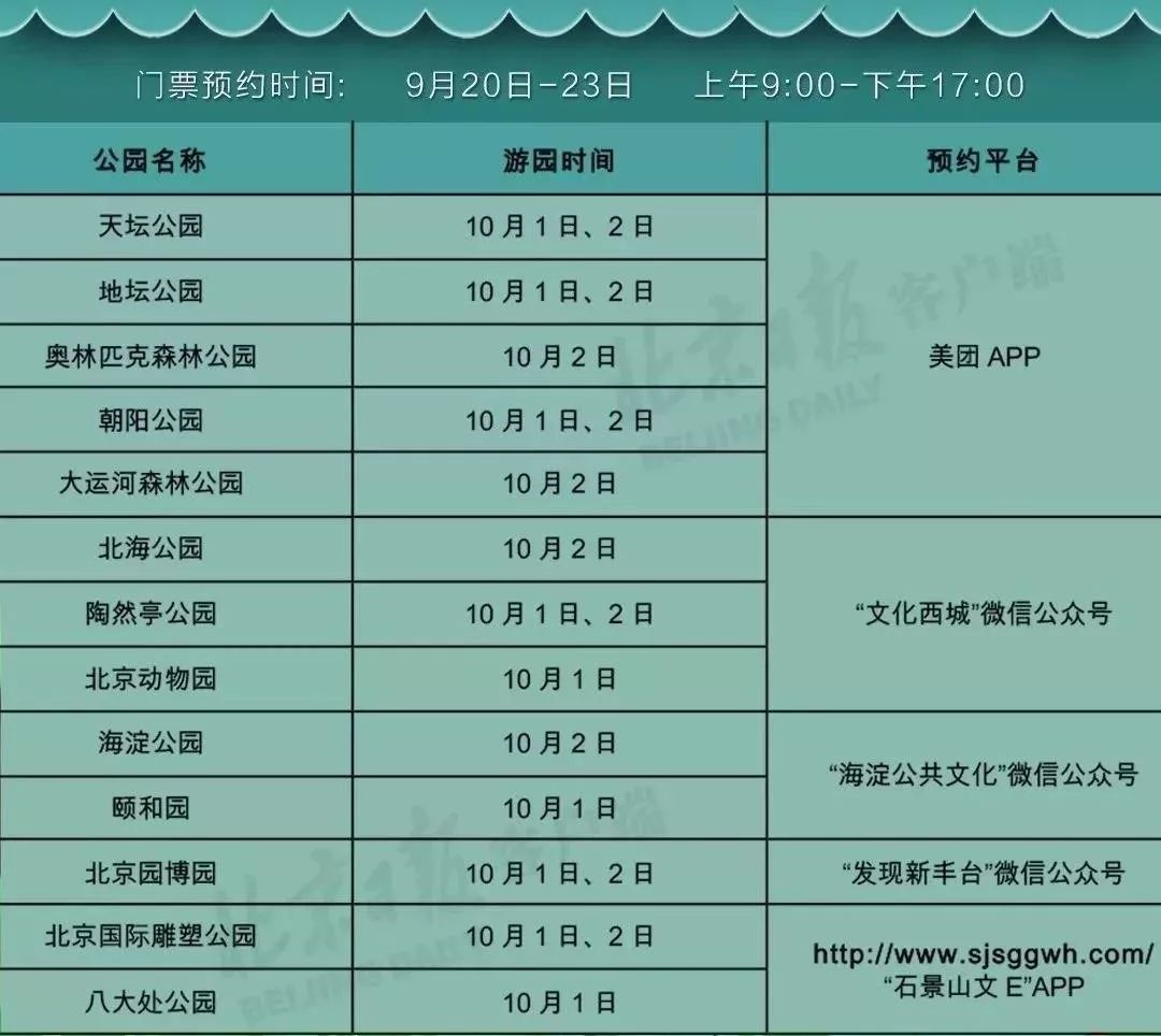 10月2日8时至18时,天坛公园等10家公园将举办游园活动,需在指定平台预约并到指定地点兑换门票。