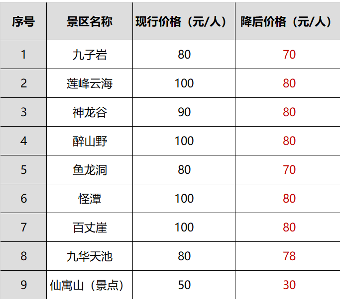 安徽池州从9月30日起,对包括4A级景区在内的9家景区下调了门票价格。其中,莲峰云海门票价格由100元/人,降为80元/人。