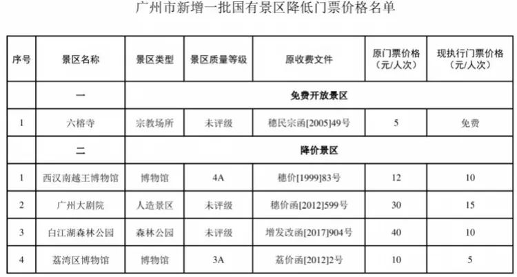 广州5个景区门票近日价格降,其中4A级景区西汉南越王博物馆门票降至10元,六榕寺门票降为免费。具体降价景区名单: