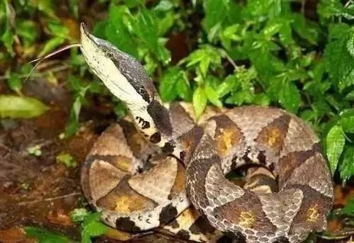 在我国分布比较广泛。样子和蝮蛇有点像,但是身材更苗条,头部更加三角形,脖子也更细。