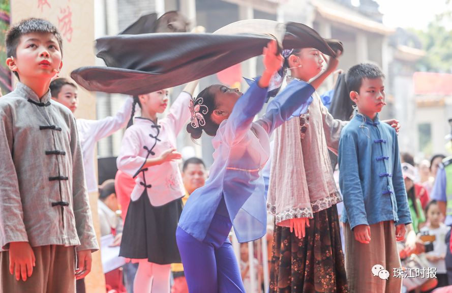 祭献礼过后,来自西樵镇第四小学的学生为现场观众献上情景剧《缕缕香云纱丝丝家国情》,生动演绎南海非物质文化遗产香云纱的制作方法。