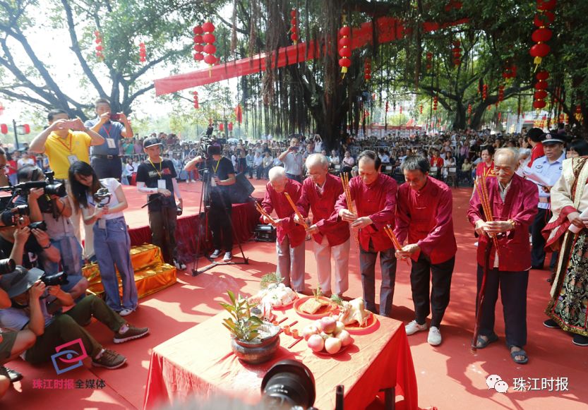 ▲西樵松塘村五房长老向孔子行祭献礼。珠江时报记者章佳琳摄