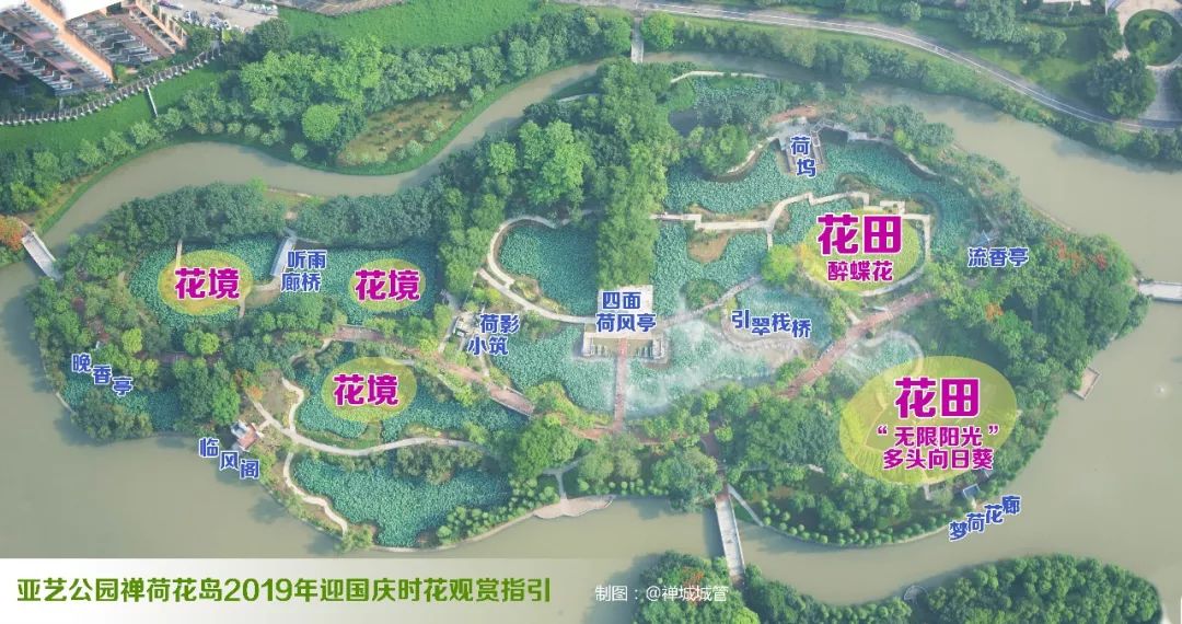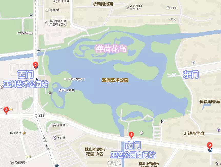 亚艺公园南门站:可搭乘105、127、138、146、160、169、806、806路夜班短线、佛k6、佛k6快线等线路到达“亚艺公园南门站”,沿公园东南侧园路步行约800米到达禅荷花岛东侧入口;